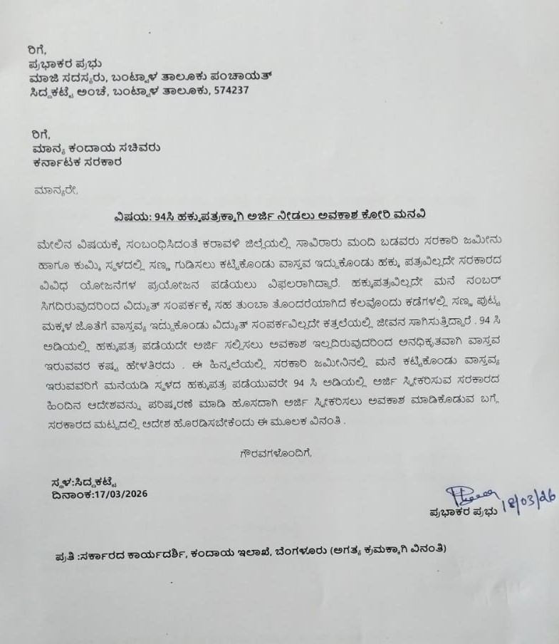 ಈ ಎಲ್ಲಾ ಹಿನ್ನಲೆಯಲ್ಲಿ ಸರಕಾರಿ ಜಮೀನಿನಲ್ಲಿ ಮನೆ ಕಟ್ಟಿಕೊಂಡು ವಾಸ್ತವ್ಯ ಇರುವವರಿಗೆ ಮನೆಯಡಿ ಸ್ಥಳದ ಹಕ್ಕುಪತ್ರ ಪಡೆಯುವರು 94 ಸಿ ಅಡಿಯಲ್ಲಿ ಅರ್ಜಿ ಸ್ವೀಕರಿಸುವ ಸರಕಾರದ ಹಿಂದಿನ ಆದೇಶವನ್ನು ಪರಿಷ್ಕರಣೆ ಮಾಡಿ ಹೊಸದಾಗಿ ಅರ್ಜಿ ಸ್ವೀಕರಿಸಲು ಅವಕಾಶ ಮಾಡಿಕೊಡಬೇಕಾಗಿ ಸರಕಾರದ ಮಟ್ಟದಲ್ಲಿ ಆದೇಶ ಹೊರಡಿಸಬೇಕೆಂದು ಬಂಟ್ವಾಳ ತಾಲೂಕು ಪಂಚಾಯತ್ ನ ಮಾಜಿ ಸದಸ್ಯರಾದ ಪ್ರಭಾಕರ ಪ್ರಭು ಅವರು ಮಾನ್ಯ ಕಂದಾಯ ಸಚಿವರಿಗೆ ಈ ಮೂಲಕ ವಿನಂತಿಸಿಕೊಂಡಿದ್ದಾರೆ.