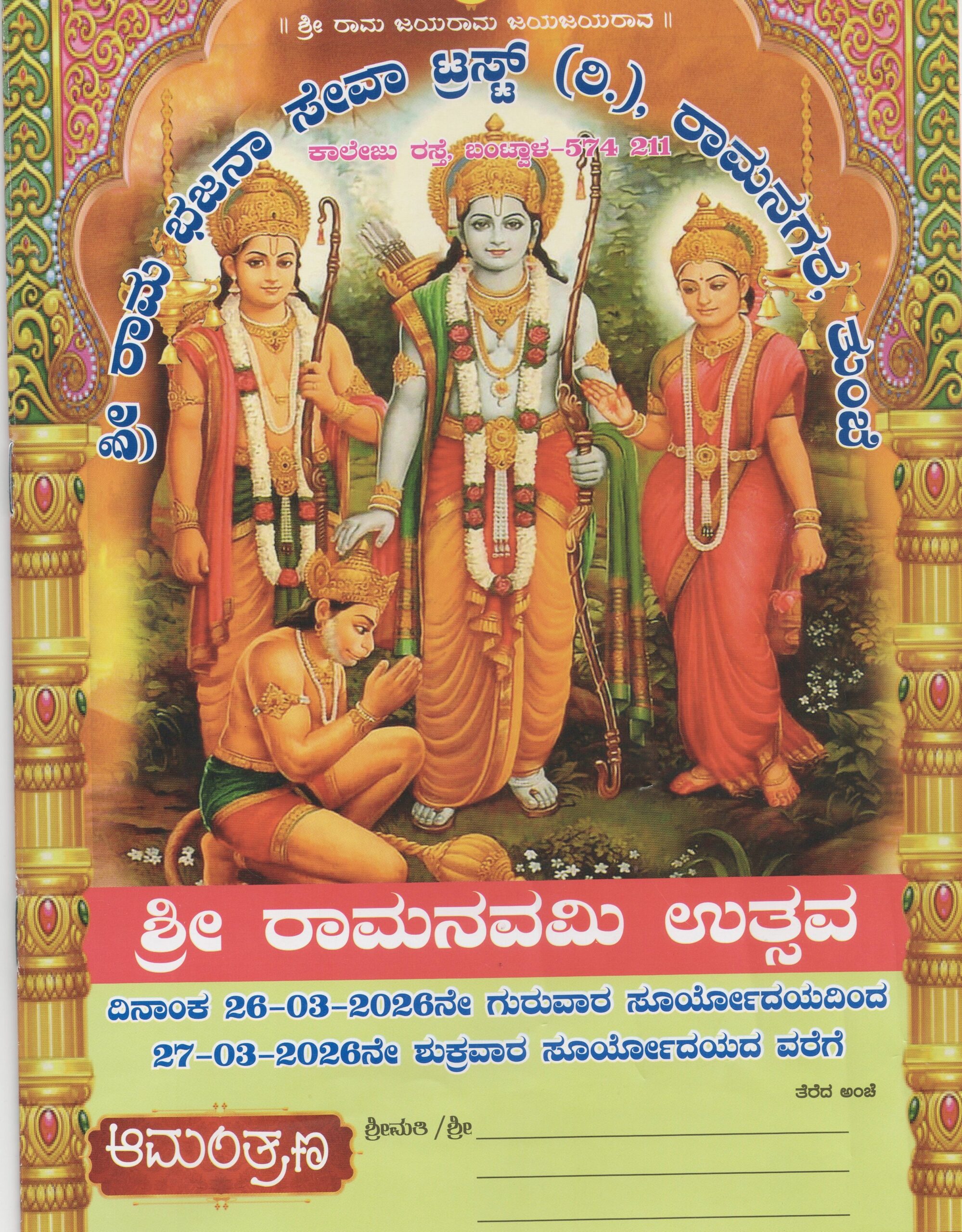 ಬಂಟ್ವಾಳ: ಶ್ರೀ ರಾಮ ಭಜನಾ ಸೇವಾ ಟ್ರಸ್ಟ್ (ರಿ.) ರಾಮನಗರ ತುಂಬೆಯ ಶ್ರೀ ರಾಮ ಭಜನಾ ಮಂದಿರದಲ್ಲಿ ಶ್ರೀ ರಾಮನವಮಿ ಪ್ರಯುಕ್ತ ಏಕಾಹ ಭಜನೋತ್ಸವವು ಭಕ್ತಿಭಾವದಿಂದ ನಡೆಯಲಿದೆ.