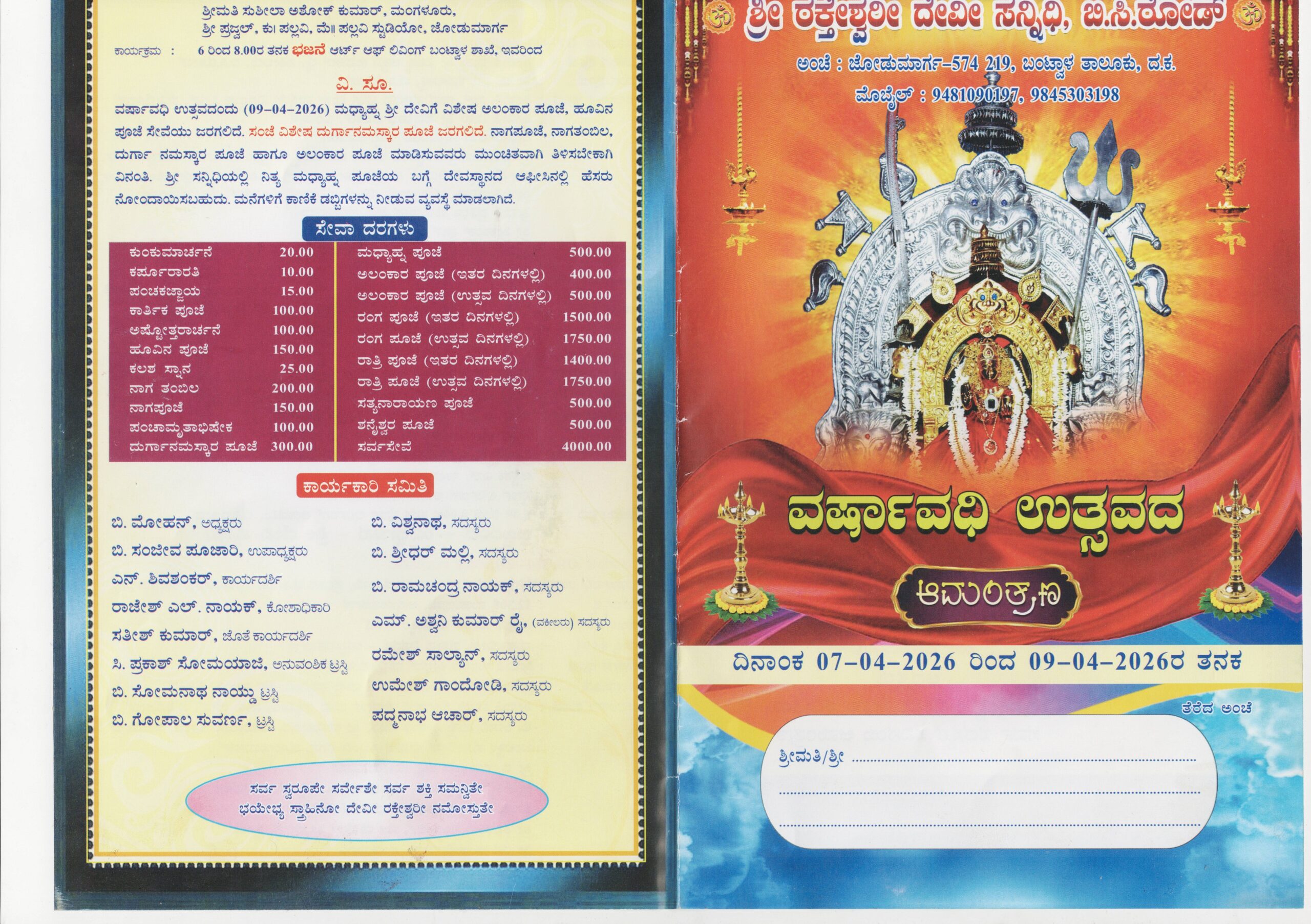 ಬಂಟ್ವಾಳ, ಮಾರ್ಚ್ 23: ತಾಲೂಕಿನ ಜೋಡುಮಾರ್ಗದ ಬಿ.ಸಿ ರೋಡ್ ನಲ್ಲಿ ಇರುವ ಶ್ರೀ ರಕ್ತೇಶ್ವರಿ ದೇವೀ ಸನ್ನಿಧಿಯ ವರ್ಷಾವಧಿ ಉತ್ಸವವು ಏಪ್ರಿಲ್ 7ರಿಂದ 9ರವರೆಗೆ ಭಕ್ತಿಭಾವದಿಂದ ನಡೆಯಲಿದೆ.