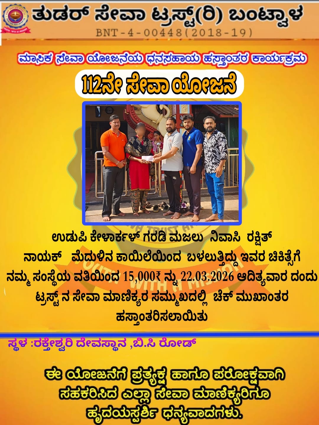 ಮಾ. 22 ರಂದು ಬಿ.ಸಿ ರೋಡಿನ ರಕ್ತೇಶ್ವರಿ ದೇವಸ್ಥಾನದಲ್ಲಿ ಟ್ರಸ್ಟ್ನ ಸೇವಾ ಮಾಣಿಕ್ಯರ ಸಮ್ಮುಖದಲ್ಲಿ ₹15,000 ಮೊತ್ತವನ್ನು ಚೆಕ್ ಮುಖಾಂತರ ಹಸ್ತಾಂತರಿಸಲಾಯಿತು.