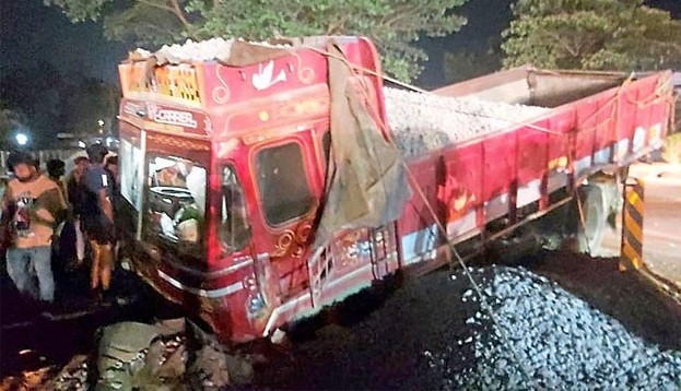 ಜಲ್ಲಿ ಸಾಗಿಸುತ್ತಾ ಉಡುಪಿ ಕಡೆಯಿಂದ ಕುಂದಾಪುರದತ್ತ ಸಾಗುತ್ತಿದ್ದ ಲಾರಿ ನಿಯಂತ್ರಣ ತಪ್ಪಿ ಡಿವೈಡರ್ ಏರಿ ಬಳಿಕ ಪಕ್ಕದ ಹೊಂಡಕ್ಕೆ ಬಿದ್ದಿದೆ.