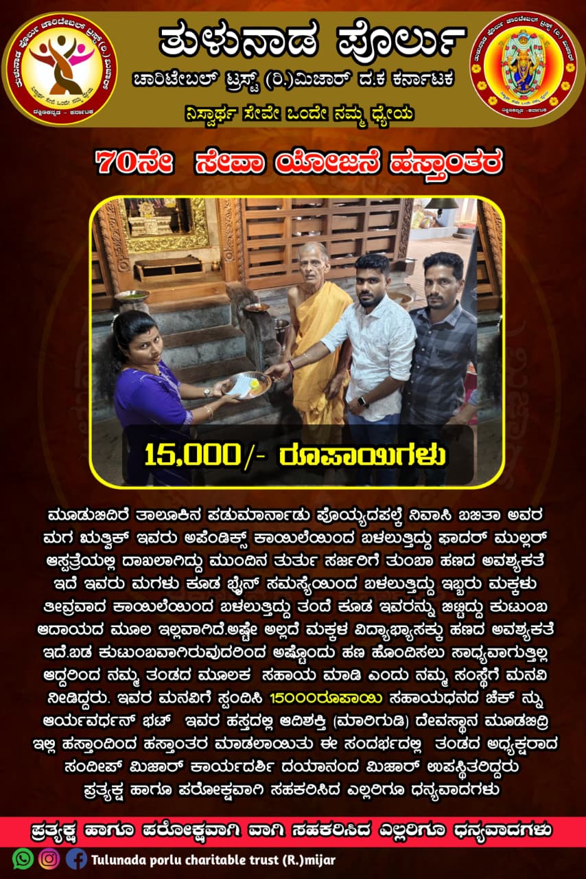 ಈ ಮನವಿಗೆ ಸ್ಪಂದಿಸಿದ ತುಳುನಾಡ ಪೊರ್ಲು ಚಾರಿಟೇಬಲ್ ಟ್ರಸ್ಟ್ ನವರು ಈ ಟ್ರಸ್ಟಿನ ವತಿಯಿಂದ 15,000 ರೂ. ಸಹಾಯಧನದ ಚೆಕ್ ಅನ್ನು ಮೂಡುಬಿದಿರೆಯ ಆದಿಶಕ್ತಿ ಮಾರಿಗುಡಿ ದೇವಸ್ಥಾನದಲ್ಲಿ ಆರ್ಯವರ್ಧನ್ ಭಟ್ ಅವರ ಮೂಲಕ ಹಸ್ತಾಂತರಿಸಲಾಯಿತು.