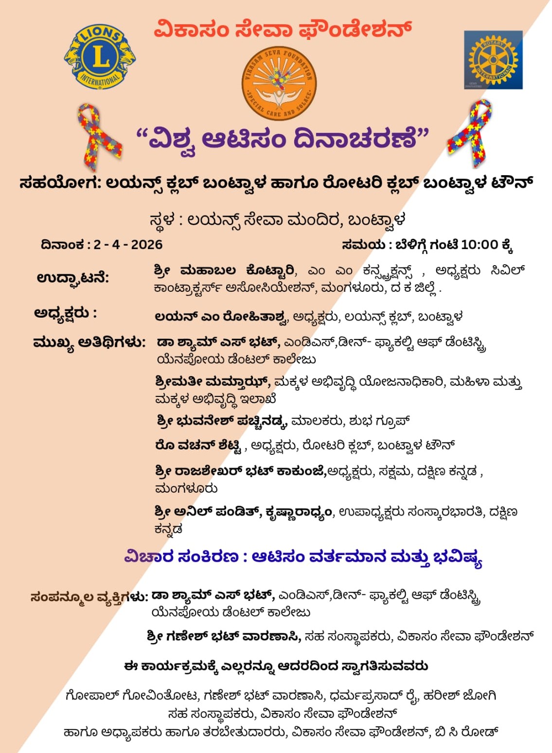ಬಂಟ್ವಾಳ: ಕಳೆದ ಮೂರು ವರ್ಷಗಳಿಂದ ಬಂಟ್ವಾಳ ತಾಲೂಕಿನಲ್ಲಿ ಆಟಿಸಂ ಮಕ್ಕಳ ತರಬೇತಿ ಹಾಗೂ ಶಿಕ್ಷಣ ಕ್ಷೇತ್ರದಲ್ಲಿ ಕೆಲಸ ಮಾಡುತ್ತಿರುವ ಬಿ ಸಿ ರೋಡಿನ ವಿಕಾಸಂ ಸೇವಾ ಫೌಂಡೇಶನ್ ವತಿಯಿಂದ ಲಯನ್ಸ್ ಕ್ಲಬ್ ಬಂಟ್ವಾಳ, ರೋಟರಿ ಕ್ಲಬ್ ಬಂಟ್ವಾಳ ಟೌನ್ ಹಾಗೂ ಸಕ್ಷಮ ದಕ್ಷಿಣ ಕನ್ನಡ ಇವರ ಸಹಯೋಗದೊಂದಿಗೆ ಏ. 02 ರಂದು ವಿಶ್ವ ಆಟಿಸಂ ಜಾಗೃತಿ ದಿನಾಚರಣೆಯನ್ನು ಹಮ್ಮಿಕೊಳ್ಳಲಾಗಿದೆ.