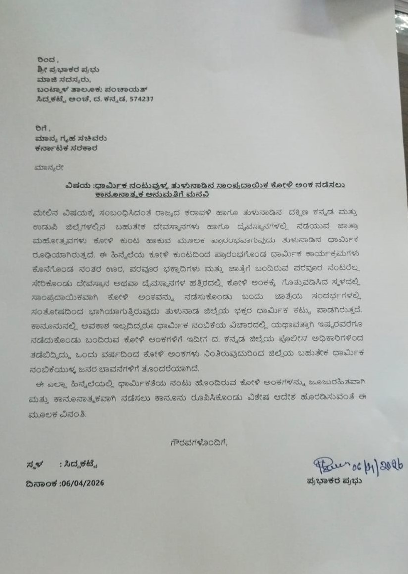 ಈ ಎಲ್ಲಾ ಹಿನ್ನೆಲೆಯಲ್ಲಿ ಧಾರ್ಮಿಕತೆಯ ನಂಟು ಹೊಂದಿರುವ ಕೋಳಿ ಅಂಕಗಳನ್ನು ಜೂಜು ರಹಿತವಾಗಿ ಮತ್ತು ಕಾನೂನಾತ್ಮಕವಾಗಿ ನಡೆಸಲು ಕಾನೂನು ರೂಪಿಸಿಕೊಂಡು ವಿಶೇಷ ಆದೇಶ ಹೊರಡಿಸುವಂತೆ ಬಂಟ್ವಾಳ ತಾಲೂಕು ಪಂಚಾಯತ್ ನ ಮಾಜಿ ಸದಸ್ಯರಾದ ಪ್ರಭಾಕರ ಪ್ರಭು ಅವರು ಮಾನ್ಯ ಗೃಹ ಸಚಿವರಿಗೆ ಈ ಮೂಲಕ ವಿನಂತಿಸಿಕೊಂಡಿದ್ದಾರೆ.