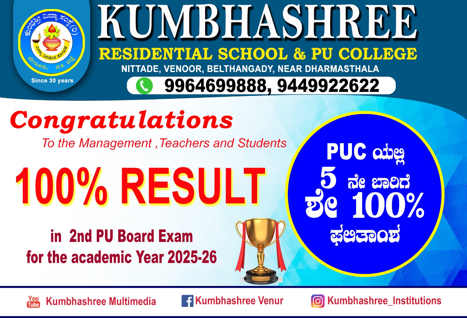 ವೇಣೂರು: 2025 – 26ನೇ ಸಾಲಿನ ದ್ವಿತೀಯ ಪಿಯುಸಿ ಫಲಿತಾಂಶ ಪ್ರಕಟವಾಗಿದ್ದು, ದಕ್ಷಿಣ ಕನ್ನಡ ಜಿಲ್ಲೆಯ ವೇಣೂರಿನ ಕುಂಭಶ್ರೀ ವಿದ್ಯಾ ಸಂಸ್ಥೆ (ರಿ) ಶೇ.100 ಫಲಿತಾಂಶ ಸಾಧಿಸಿದೆ.