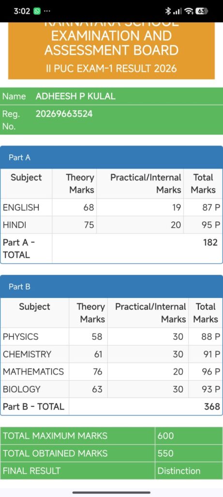 ಬಂಟ್ವಾಳ: 2025–26ನೇ ಸಾಲಿನ ದ್ವಿತೀಯ ಪಿಯುಸಿ ಫಲಿತಾಂಶ ಪ್ರಕಟವಾಗಿದ್ದು, ವಿಜ್ಞಾನ ವಿಭಾಗದಲ್ಲಿ ಅದೀಸ್ ಕುಲಾಲ್ ಅವರು 550 ಅಂಕಗಳನ್ನು ಪಡೆದು ಉತ್ತೀರ್ಣರಾಗಿದ್ದಾರೆ.