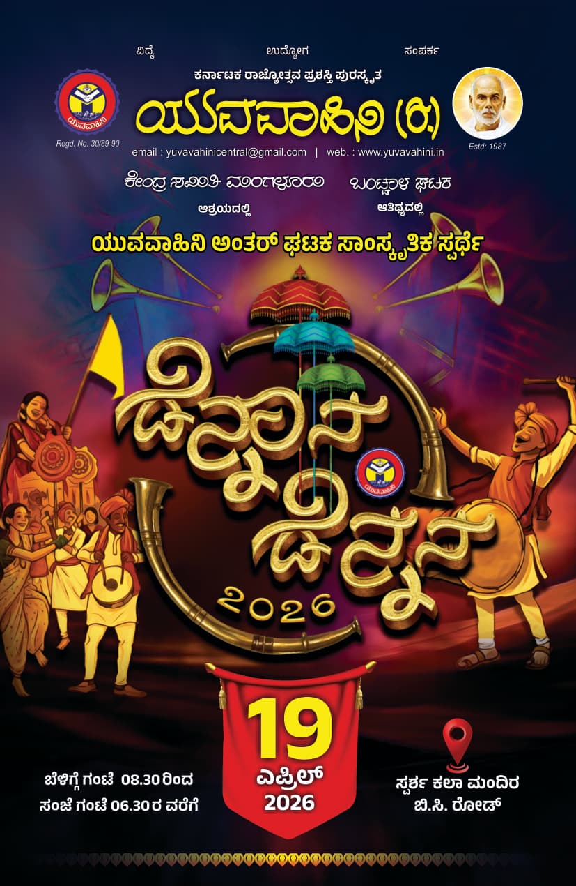 ಬಂಟ್ವಾಳ : ಯುವವಾಹಿನಿ ಕೇಂದ್ರ ಸಮಿತಿಯ ಆಶ್ರಯದಲ್ಲಿ ಯುವವಾಹಿನಿ ಬಂಟ್ವಾಳ ಘಟಕದ ಆತಿಥ್ಯದಲ್ಲಿ ಯುವವಾಹಿನಿ ಅಂತರ್ ಘಟಕ ಸಾಂಸ್ಕೃತಿಕ ಸ್ಪರ್ಧೆ ಡೆನ್ನಾನ ಡೆನ್ನನ 2026, ಬಿ.ಸಿ.ರೋಡ್ ಸ್ಪರ್ಶ ಕಲಾ ಮಂದಿರದಲ್ಲಿ ಏ. 19 ರಂದು ಬೆಳಗ್ಗೆ 08.30 ರಿಂದ ಸಂಜೆ 06.30 ರ ವರೆಗೆ ನಡೆಯಲಿದೆ.