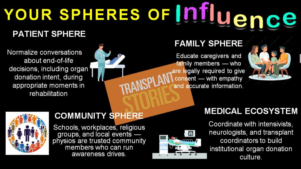 ಫಿಸಿಯೋಥೆರಪಿಸ್ಟ್ಗಳು ಅಂಗಾಂಗ ದಾನದ ವಕೀಲರಾಗಿ: ನಮ್ಮ ಫಿಸಿಯೋ ತಜ್ಞರು ಏಕೆ ಅಂಗಾಂಗ ದಾನದ ಆರೋಗ್ಯ ವಕೀಲರಾಗಬಹುದು ಎಂಬುದನ್ನು ಡಾ. ಮೋನಿಸ್ ವಿವರಿಸಿದರು. ರೋಗಿ, ಕುಟುಂಬ, ಸಮುದಾಯ ಮತ್ತು ವೈದ್ಯಕೀಯ ವ್ಯವಸ್ಥೆಯ ಮೇಲೆ ಫಿಸಿಯೋಗಳ ಪ್ರಭಾವ ಹೆಚ್ಚಿರುತ್ತದೆ. - ಅವರು ಸಮುದಾಯದಲ್ಲಿ ವಿಶ್ವಾಸಾರ್ಹ ಮಾಹಿತಿ ಕೇಂದ್ರಗಳಾಗಿರುತ್ತಾರೆ.
