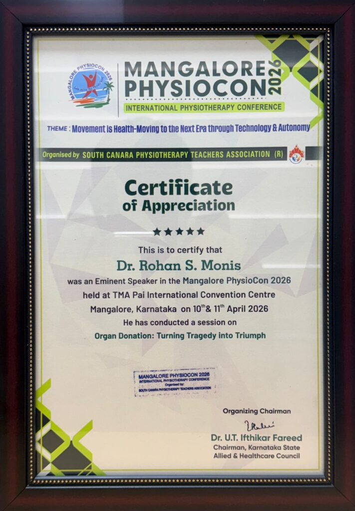 ಮಂಗಳೂರಿನಲ್ಲಿ ನಡೆದ ಭಾರತದ ಅತಿದೊಡ್ಡ ಫಿಸಿಯೋಥೆರಪಿ ಸಮ್ಮೇಳನದಲ್ಲಿ ಆರ್.ಟಿ.ಎನ್ ಪಿ.ಎಚ್.ಎಫ್ ಡಾ. ರೋಹನ್ ಎಸ್. ಮೋನಿಸ್ ಅವರು ‘ಅಂಗಾಂಗ ದಾನ – ದುರಂತವನ್ನು ವಿಜಯವನ್ನಾಗಿ ಪರಿವರ್ತಿಸುವುದು’ ಎಂಬ ವಿಷಯದ ಕುರಿತು ತಮ್ಮ ವಿಚಾರಗಳನ್ನು ಹಂಚಿಕೊಂಡರು.