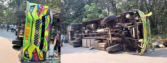 ಬೆಳ್ತಂಗಡಿ: ಖಾಸಗಿ ಬಸ್ ಚಾಲಕನ ನಿಯಂತ್ರಣ ತಪ್ಪಿದ ಪರಿಣಾಮ ಬಸ್ ಪಲ್ಟಿಯಾಗಿ 20 ಕ್ಕೂ ಹೆಚ್ಚು ಪ್ರಯಾಣಿಕರು ಗಾಯಗೊಂಡ ಘಟನೆ ಚಾರ್ಮಾಡಿ ಘಾಟ್ನ ನಾಲ್ಕನೇ ತಿರುವಿನಲ್ಲಿ ನಡೆದಿದೆ.