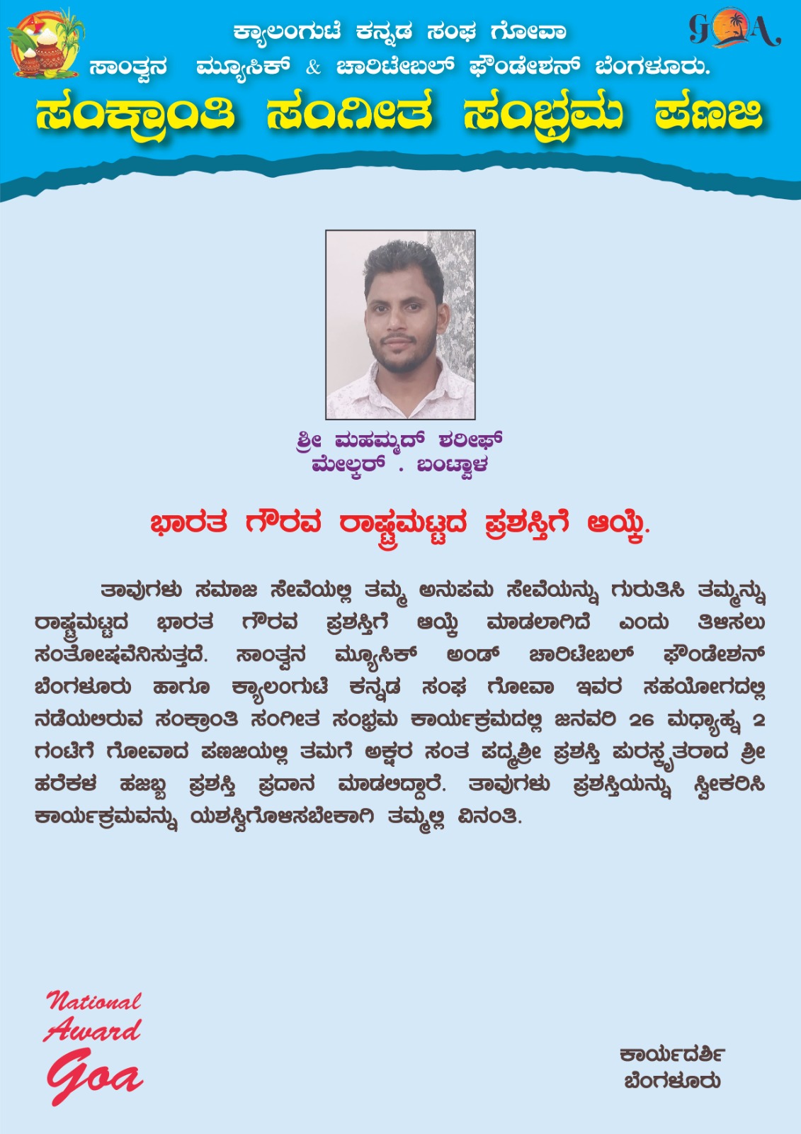 ಇದೇ ಜನವರಿ 26 ರಂದು ಗಣರಾಜ್ಯೋತ್ಸವದ ಅಂಗವಾಗಿ ಗೋವಾದ ಪಣಜಿಯಲ್ಲಿ ಸಾಂತ್ವನ ಫೌಂಡೇಶನ್ ಹಾಗೂ ಕಲ್ಲಂಗುಟ್ ಕನ್ನಡ ಸಂಘ ಗೋವಾ ಇವರು ಹಮ್ಮಿಕೊಂಡಿರುವ ಸಂಕ್ರಾಂತಿ ಸಂಗೀತ ಸಂಭ್ರಮ ಸಮಾರಂಭದಲ್ಲಿ ಮಹಮ್ಮದ್ ಶರೀಫ್ ಅವರಿಗೆ ಸಮಾಜ ಸೇವೆಯ ಕ್ಷೇತ್ರದಲ್ಲಿ ಗುರುತಿಸಿ ಭಾರತ ಗೌರವ ಪ್ರಶಸ್ತಿಯನ್ನು ನೀಡಲಾಗುವುದು.