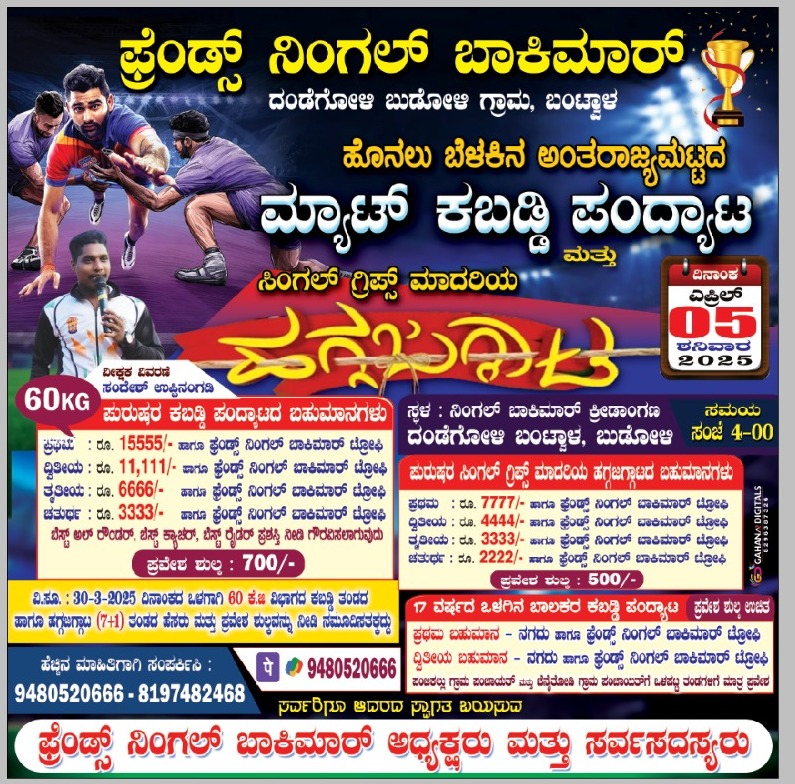 ಬಂಟ್ವಾಳ : ಫ್ರೆಂಡ್ಸ್ ನಿಂಗಲ್ ಬಾಕಿಮಾರ್ ದಂಡೆ ಗೋಳಿ ಬುಡೋಳಿ ಇದರ ಆಶ್ರಯದಲ್ಲಿ ಹೊನಲು ಬೆಳಕಿನ ಅಂತರಾಜ್ಯಮಟ್ಟದ ಮ್ಯಾಟ್ ಕಬಡ್ಡಿ ಪಂದ್ಯಾಟ ಮತ್ತು ಸಿಂಗಲ್ ಗ್ರಿಪ್ಸ್ ಮಾದರಿಯ ಹಗ್ಗಜಗ್ಗಾಟ ಪಂದ್ಯಾಟವು ಎಪ್ರಿಲ್ 05, ಶನಿವಾರ 2025 ರಂದು ನಿಂಗಲ್ ಬಾಕಿಮಾರ್ ಕ್ರೀಡಾಂಗಣ ದಂಡೆ ಗೋಳಿ, ಬುಡೋಳಿಯಲ್ಲಿ ಸಂಜೆ 4-00 ಗಂಟೆಗೆ ನಡೆಯಲಿದೆ.