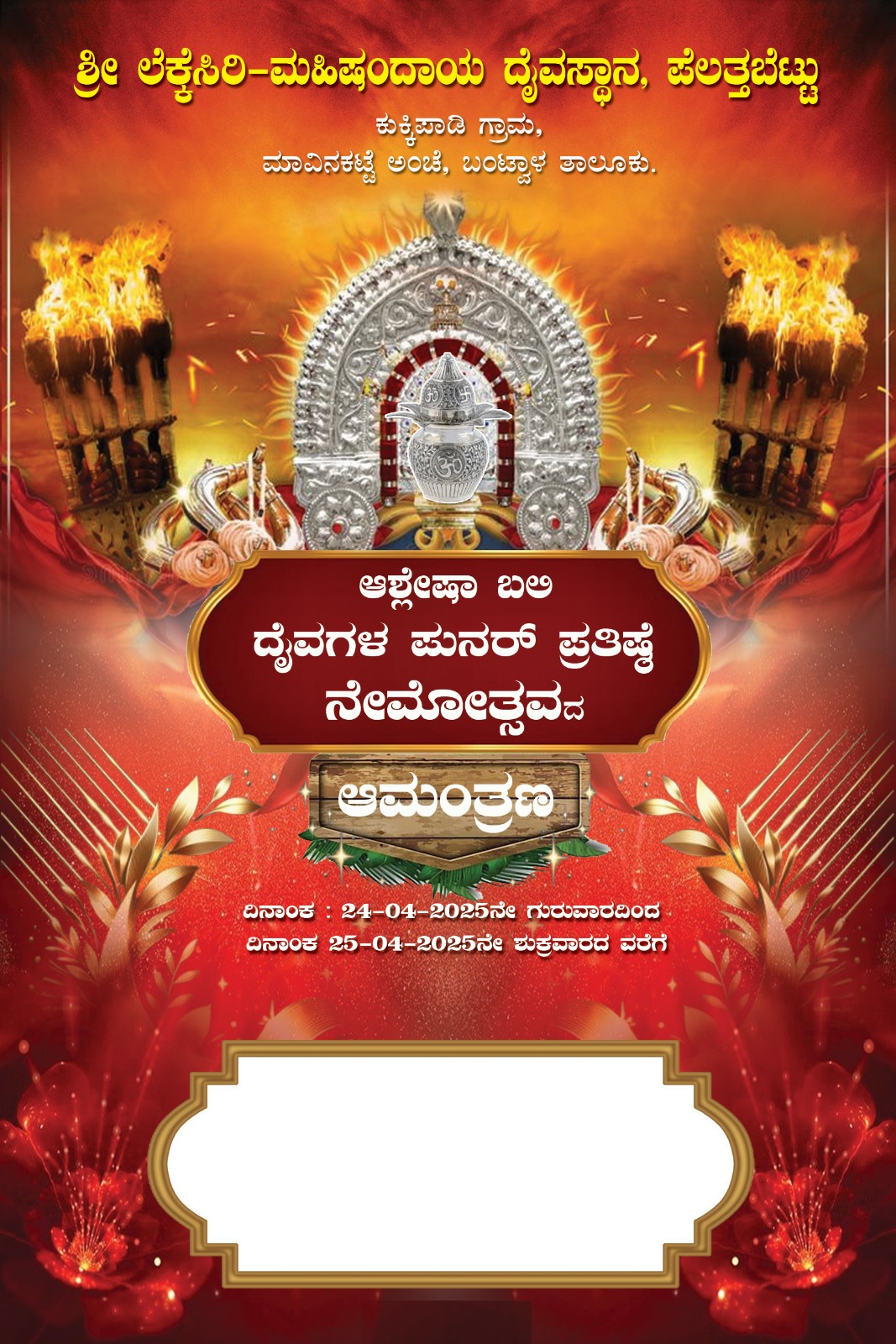 ಬಂಟ್ವಾಳ : ತಾಲೂಕಿನ ಕುಕ್ಕಿಪಾಡಿ ಗ್ರಾಮದ ಕುದ್ಕೋಳಿಯ ಪೆಲತ್ತಬೆಟ್ಟು ಶ್ರೀ ಲೆಕ್ಕೆಸಿರಿ ದೈವಸ್ಥಾನದಲ್ಲಿ ದೈವಗಳ ಪ್ರತಿಷ್ಠೆ ಆಶ್ಲೇಷಾ ಬಲಿ ನೇಮೋತ್ಸವವು ಏ. 24 ರಿಂದ ಏ. 25ರವರೆಗೆ ನಡೆಯಲಿದೆ.