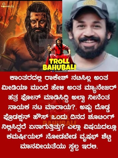 ಮಾತ್ರವಲ್ಲ ಟ್ರೋಲ್ ಬಾಹುಬಲಿ ಪೇಜ್ ನಲ್ಲಿ ಈ ಕುರಿತು ಬರೆಯಲಾಗಿದ್ದು ಕಾಂತರದಲ್ಲಿ ರಾಕೇಶ್ ನಟಿಸಿಲ್ಲ ಅಂತ ಮೀಡಿಯಾ ಮುಂದೆ ಹೇಳಿ ಅಂತ ಮ್ಯಾನೇಜರ್ ಹತ್ರ ಫೋನ್ ಮಾಡಿಸಿದ್ದಿ ಅಲ್ವಾ .ನೀನೆಂತ ನಾಯಕ ನಟ ಮಾರಾಯ?. ಅಷ್ಟು ದೊಡ್ಡ ಪ್ರೊಡಕ್ಷನ್ ಹೌಸ್ ಒಂದು ದಿನದ ಶೂಟಿಂಗ್ ನಿಲ್ಲಿಸಿದ್ದರೆ ಏನಾಗುತ್ತಿತ್ತು? ಎಲ್ಲಾ ವಿಷಯದಲ್ಲೂ ಕಮರ್ಷಿಯಲ್ ನೋಡಬೇಡ ವೃಷಭ್ ಶೆಟ್ಟಿ ಮಾನವೀಯತೆಯು ಸ್ವಲ್ಪ ಇರಲಿ ಅನ್ನುವ ಪೋಸ್ಟ್ ವೈರಲ್ ಆಗುತ್ತಿದೆ.