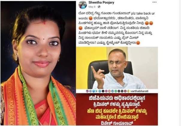 ಮಂಗಳೂರು: ಇತ್ತೀಚಿಗೆ ಬಜ್ಪೆಯಲ್ಲಿ ದುಷ್ಕರ್ಮಿಗಳಿಂದ ಹತ್ಯೆಗೀಡಾದ ಹಿಂದೂ ಕಾರ್ಯಕರ್ತ ಸುಹಾಸ್ ಶೆಟ್ಟಿ ಹತ್ಯೆ ನಡೆದ ಸ್ಥಳದಲ್ಲಿ ಕಾಣಿಸಿಕೊಂಡ ಬುರ್ಖಾಧಾರಿ ಮಹಿಳೆಯರನ್ನು ಯಾಕೆ ಬಂಧಿಸಿಲ್ಲ ಎಂದು ಜಿಲ್ಲಾ ಉಸ್ತುವಾರಿ ಸಚಿವ ದಿನೇಶ್ ಗುಂಡೂರಾವ್ ಅವರನ್ನು ಸಾಮಾಜಿಕ ಜಾಲತಾಣಗಳಲ್ಲಿ ಪ್ರಶ್ನಿಸಿದ್ದ ಬಿಜೆಪಿ ಮಹಿಳಾಮೋರ್ಚಾ ರಾಜ್ಯ ಕಾರ್ಯದರ್ಶಿ, ಮನಪಾ ನಿಕಟಪೂರ್ವ ಸದಸ್ಯೆ ಶ್ವೇತಾ ಪೂಜಾರಿ ಮೇಲೆ ಎಫ್ಐಆರ್ ದಾಖಲಾಗಿದ್ದು, ಸಾರ್ವಜನಿಕರಿಂದ ವ್ಯಾಪಕ ಖಂಡನೆ ವ್ಯಕ್ತವಾಗಿದೆ.