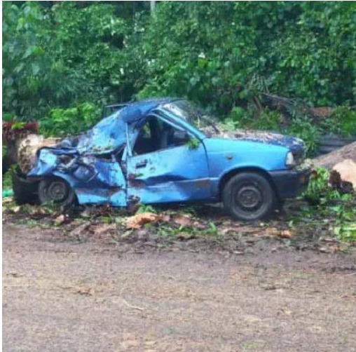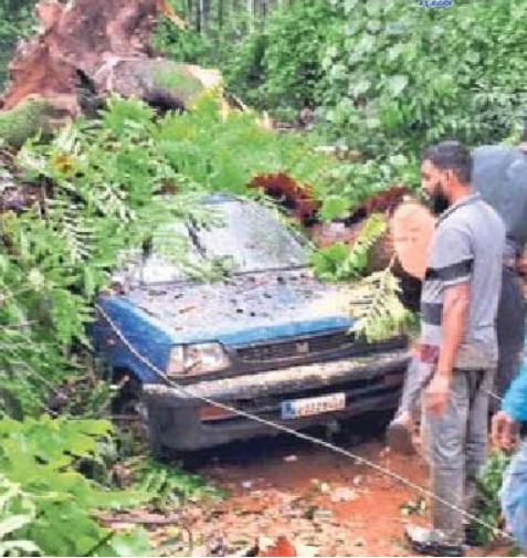 ಈ ವೇಳೆ ಮರ ಬೀಳುವ ಶಬ್ದ ಕೇಳಿ ಕಾರಿನಲ್ಲಿದ್ದ ಮೂವರು ದೂರ ಓಡಿ ಹೋಗಿ ಪ್ರಾಣ ಉಳಿಸಿಕೊಂಡಿದ್ದಾರೆ.