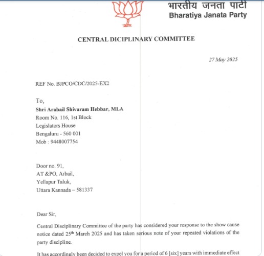 ಈ ಕುರಿತು ಮಾತನಾಡಿದ್ದ ಬಿಜೆಪಿ ರಾಜ್ಯ ಘಟಕದ ಶಿಸ್ತು ಸಮಿತಿ ಅಧ್ಯಕ್ಷ ಲಿಂಗರಾಜ ಪಾಟೀಲ ಅವರು ಎಸ್.ಟಿ. ಸೋಮಶೇಖರ್ ಮತ್ತು ಶಿವರಾಮ ಹೆಬ್ಬಾರ್ ಅವರನ್ನು ಪಕ್ಷದಿಂದ ಉಚ್ಚಾಟಿಸುವಂತೆ ಕೇಂದ್ರ ಸಮಿತಿಗೆ ವರದಿ ನೀಡಿದ್ದೇನೆ ಅಂತ ಹೇಳಿದ್ದರು.