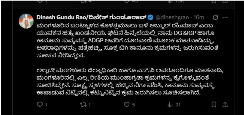 ಬಂಟ್ವಾಳ: ಕೊಳತ್ತಮಜಲು ಬಳಿ ನಡೆದ ಅಬ್ದುಲ್ ರಹಿಮಾನ್ ಎಂಬ ಯುವಕನ ಹತ್ಯೆಗೆ ಜಿಲ್ಲಾ ಉಸ್ತುವಾರಿ ಸಚಿವ ದಿನೇಶ್ ಗುಂಡೂರಾವ್ ಪ್ರತಿಕ್ರಿಯೆ ನೀಡಿದ್ದಾರೆ.