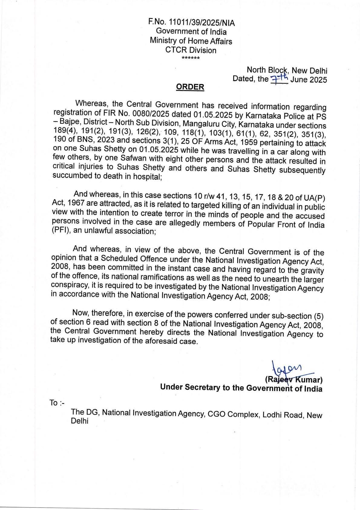 ಮೇ 1 ರಂದು ಬಜ್ಪೆಯಲ್ಲಿ ಹತ್ಯೆಯಾಗಿದ್ದ ಹಿಂದೂ ಕಾರ್ಯಕರ್ತ ಸುಹಾಸ್ ಶೆಟ್ಟಿ ಹತ್ಯೆ ಹಿಂದೆ ಉಗ್ರವಾದಿ ಸಂಘಟನೆಗಳ ಕೈವಾಡವಿದೆ, ಅಲ್ಲದೆ ಈ ಹತ್ಯೆಯ ಹಿಂದೆ ಸ್ಥಳೀಯ ಅಧಿಕಾರಿಗಳ ಕೈವಾಡ ದ ಬಗ್ಗೆ ಹಿಂದೂ ಸಂಘಟನೆ ಗಳು ಶಂಕೆ ವ್ಯಕ್ತಪಡಿಸಿದ್ದ ವು ಹಾಗಾಗಿ ಈ ಹತ್ಯೆಯ ಕೇಸ್ ಅನ್ನು ಎನ್ ಐ ಎ (NIA) ಗೆ ವಹಿಸಬೇಕೆಂದು ಆಗ್ರಹಿಸಿದ್ದವು, ಈಗ ಸಂಘಟನೆ ಗಳ ಹೋರಾಟಕ್ಕೆ ಜಯ ಸಿಕ್ಕಿದ್ದು ಇದೀಗ ಕೇಂದ್ರ ಗೃಹ ಸಚಿವಾಲಯವು ಸುಹಾಸ್ ಶೆಟ್ಟಿ ಹತ್ಯೆ ಪ್ರಕರಣದ ತನಿಖೆಯನ್ನು ರಾಷ್ಟ್ರೀಯ ತನಿಖಾ ದಳ (NIA) ಗೆ ವಹಿಸಿದೆ.