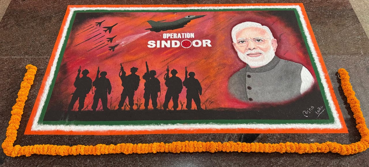 ಬೆಳ್ತಂಗಡಿ: ಲಾಯಿಲ ಸಭಾಭವನದಲ್ಲಿ ನಡೆದ ಬಿಜೆಪಿ ಬೆಳ್ತಂಗಡಿ ಮಂಡಲ ಕಾರ್ಯಕಾರಿಣಿ ಹಾಗೂ ವಿಕಸಿತ ಸಂಕಲ್ಪ ಭಾರತ ಸಂಕಲ್ಪ ಸಭೆಯಲ್ಲಿ ಲಾಯಿಲದ ಶ್ರೀಮತಿ ಆಶಾಲತಾ ಪ್ರಶಾಂತ್ ವರ ಕೈ ಚಳಕದಲ್ಲಿ ಆಪರೇಷನ್ ಸಿಂಧೂರದ ಅದ್ಭುತ ರಂಗೋಲಿ ಚಿತ್ರ ಮೂಡಿ ಬಂದಿದೆ.
