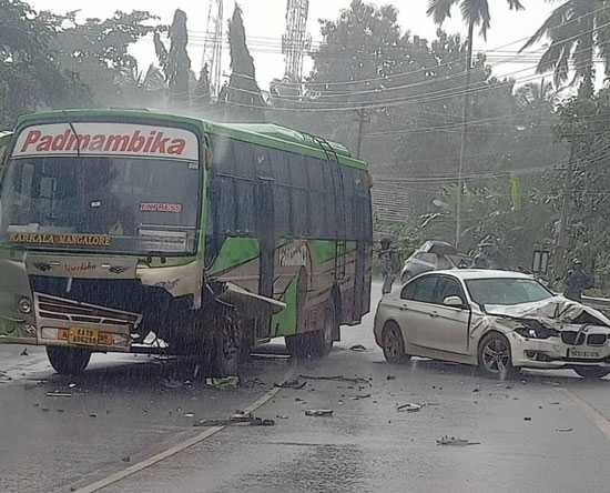 ಮಂಗಳೂರಿನಿಂದ ಕಾರ್ಕಳ ಕಡೆಗೆ ಪ್ರಯಾಣಿಸುತ್ತಿದ್ದ ಖಾಸಗಿ ಬಸ್ ಗೆ ವಿರುದ್ಧ ದಿಕ್ಕಿನಿಂದ ಬರುತ್ತಿದ್ದ ಬಿಎಂಡಬ್ಲ್ಯೂ ಡಿಕ್ಕಿ ಹೊಡೆದಿದೆ ಎನ್ನಲಾಗಿದೆ. ಡಿಕ್ಕಿಯ ತೀವ್ರತೆಗೆ ಬಿಎಂಡಬ್ಲ್ಯೂ ಸಂಪೂರ್ಣವಾಗಿ ನಜ್ಜುಗುಜ್ಜಾಗಿದೆ.