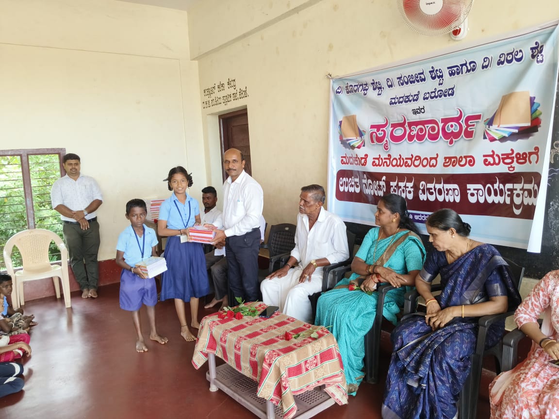 ದಿ. ಕೊರಗಪ್ಪ ಶೆಟ್ಟಿ, ದಿ. ಸಂಜೀವ ಶೆಟ್ಟಿ ಹಾಗೂ ದಿ.ವಿಠಲಶೆಟ್ಟಿ ಮದಕುಡೆ ಬರೋಡ ಇವರ ಸ್ಮರಣಾರ್ಥ ಮದಕುಡೆ ಕುಟುಂಬಸ್ಥರಾದ ಗಣೇಶ್ ಶೆಟ್ಟಿ, ಸತೀಶ್ ಶೆಟ್ಟಿ, ಶೈಲೇಶ್ ಶೆಟ್ಟಿ, ವಿಕಾಸ್ ಶೆಟ್ಟಿ, ಪ್ರಸಾದ್ ಶೆಟ್ಟಿ, ಪ್ರಶಾಂತ್ ಶೆಟ್ಟಿ, ಪ್ರಸನ್ನ ಶೆಟ್ಟಿ, ಪ್ರೀತಿ ಶೆಟ್ಟಿ, ಪಿಂಕಿ ಹಾಗೂ ಮದಕ್ಕುಡೆ ಕುಟುಂಬಸ್ಥರ ಸಹಕಾರದಲ್ಲಿ ಸರಕಾರಿ ಹಿರಿಯ ಪ್ರಾಥಮಿಕ ಶಾಲೆ ಪೆರಿಂಜೆಯ ಮಕ್ಕಳಿಗೆ ನೋಟ್ ಪುಸ್ತಕಗಳನ್ನು ವಿತರಿಸಲಾಯಿತು.