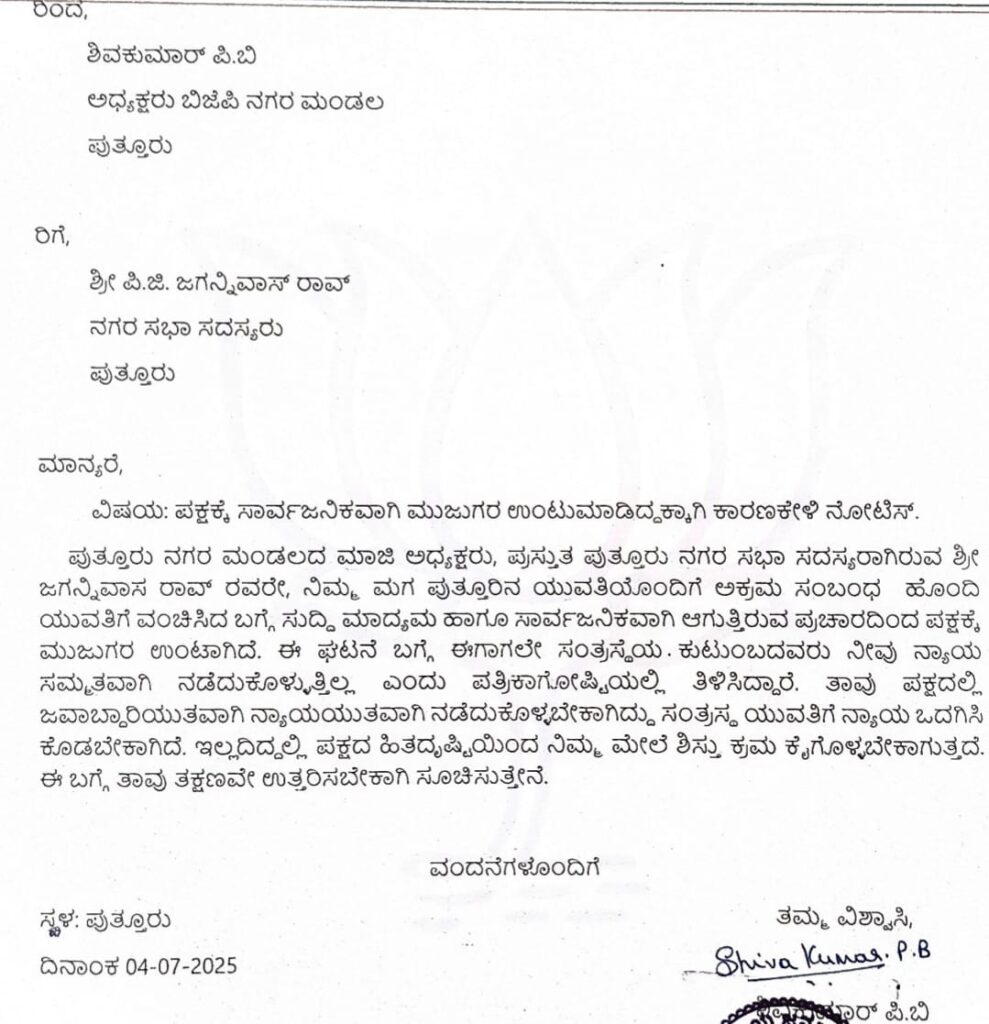 ಪುತ್ತೂರು ನಗರ ಮಂಡಲದ ಮಾಜಿ ಅಧ್ಯಕ್ಷರು, ಪ್ರಸ್ತುತ ಪುತ್ತೂರು ನಗರ ಸಭಾ ಸದಸ್ಯರಾಗಿರುವ ಜಗನ್ನಿವಾಸ ರಾವ್ ರವರೇ, ನಿಮ್ಮ ಮಗ ಪುತ್ತೂರಿನ ಯುವತಿಯೊಂದಿಗೆ ಅಕ್ರಮ ಸಂಬಂಧ ಹೊಂದಿ ಯುವತಿಗೆ ವಂಚಿಸಿದ ಬಗ್ಗೆ ಸುದ್ದಿ ಮಾದ್ಯಮ ಹಾಗೂ ಸಾರ್ವಜನಿಕವಾಗಿ ಆಗುತ್ತಿರುವ ಪ್ರಚಾರದಿಂದ ಪಕ್ಷಕ್ಕೆ ಮುಜುಗರ ಉಂಟಾಗಿದೆ. ಈ ಘಟನೆ ಬಗ್ಗೆ ಈಗಾಗಲೇ ಸಂತ್ರಸ್ಥೆಯ ಕುಟುಂಬದವರು ನೀವು ನ್ಯಾಯ ಸಮ್ಮತವಾಗಿ ನಡೆದುಕೊಳ್ಳುತ್ತಿಲ್ಲ ಎಂದು ಪತ್ರಿಕಾಗೋಷ್ಟಿಯಲ್ಲಿ ತಿಳಿಸಿದ್ದಾರೆ.