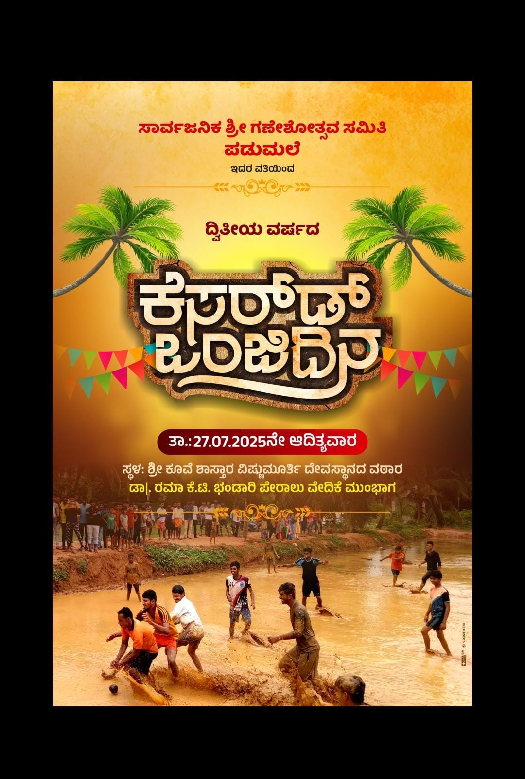ಪಡುಮಲೆ : ಸಾರ್ವಜನಿಕ ಶ್ರೀ ಗಣೇಶೋತ್ಸವ ಸಮಿತಿ ವತಿಯಿಂದ ದ್ವಿತೀಯ ವರ್ಷದ ಕೆಸರ್ಡ್ ಒಂಜಿ ದಿನ ಕಾರ್ಯಕ್ರಮವು (ಜುಲೈ 27) ಆದಿತ್ಯವಾರದಂದು ಶ್ರೀ ಕೂವೆ ಶಾಸ್ತಾರ ವಿಷ್ಣುಮೂರ್ತಿ ದೇವಸ್ಥಾನದ ವಠಾರದಲ್ಲಿ ನಡೆಯಲಿದೆ.