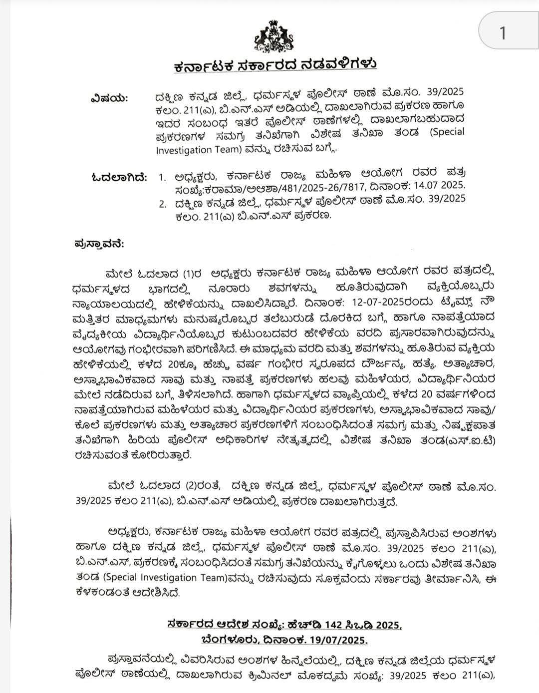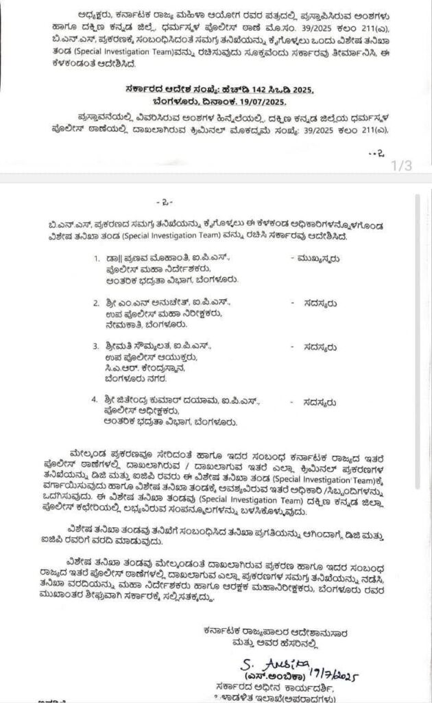 ಬೆಳ್ತಂಗಡಿ: ಧರ್ಮಸ್ಥಳ ಭಾಗದಲ್ಲಿ ನೂರಾರು ಶವಗಳನ್ನು ಹೂತಿರುವುದಾಗಿ ವ್ಯಕ್ತಿಯೊಬ್ಬರು ನ್ಯಾಯಾಲಯದಲ್ಲಿ ಹೇಳಿಕೆಯನ್ನು ದಾಖಲಿಸಿದ್ದ ಪ್ರಕರಣ ರಾಷ್ಟ್ರೀಯ ಮಟ್ಟದಲ್ಲಿ ಚರ್ಚೆಯಾಗುತ್ತಿರುವ ಹೊತ್ತಿನಲ್ಲಿ ಈ ಪ್ರಕರಣದ ತನಿಖೆ ನಡೆಸಲು ವಿಶೇಷ ತಂಡವನ್ನು ನಿಯುಕ್ತಿಗೊಳಿಸಿ ರಾಜ್ಯ ಸರ್ಕಾರ ಆದೇಶ ಹೊರಡಿಸಿದೆ.